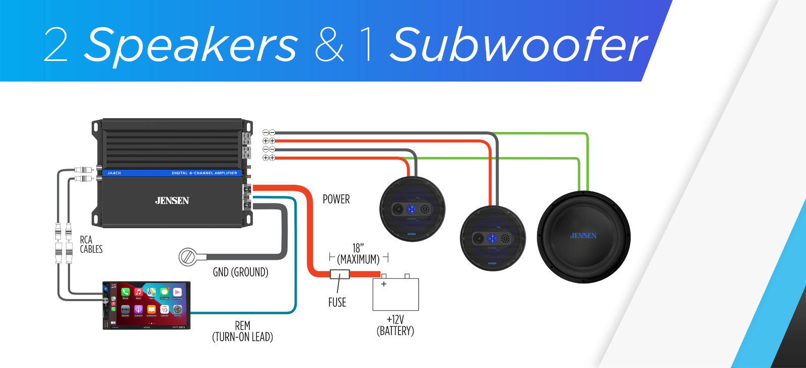The JA4CH is ideal for both stereo and subwoofer configurations. Ensure to use an 8 AWG amplifier installation kit and 16 AWG speaker wire for optimal performance. This amplifier can handle up to four speakers or two subwoofers in a bridged mode, providing great flexibility for your audio setup.